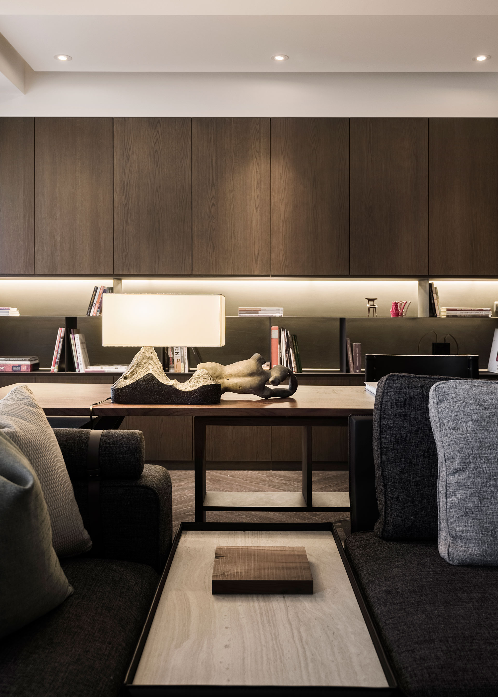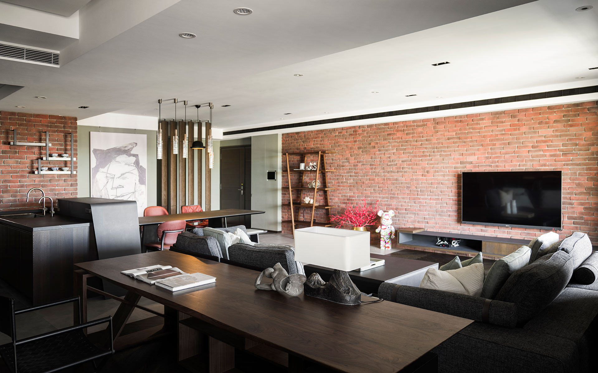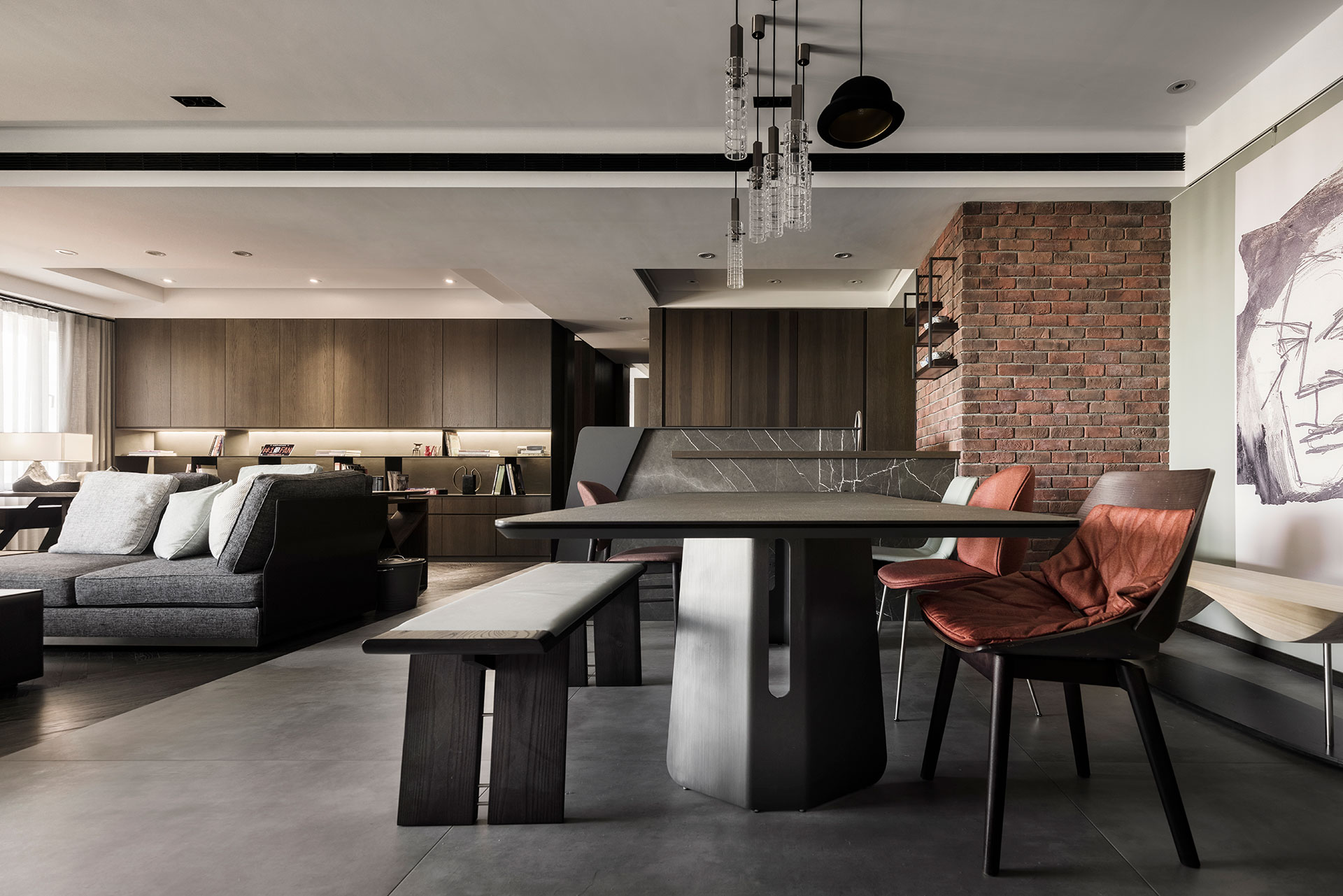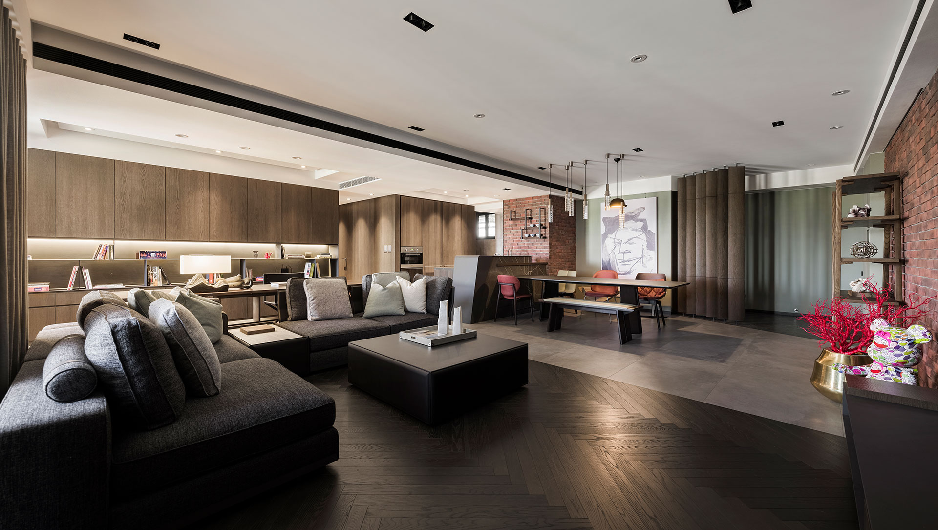屋主是年輕的設計人,喜歡古典與現代並和的元素。以連續鏤空的直向折板屏風與不規則切割地板,微間隔出一個玄關空間,與玄關座椅與畫作的藝術風格,顯現了居家也能是藝術品典藏的場所。在客廳裡造了一座六米長的磚牆,將客餐廳空間串連整合一起,延續性的手法,讓空間有大視覺主體以擴展橫向視野。客廳沙發與書房,整合在一個塊面上,餐廳與廚房、吧台在對稱方位,家中公共空間的聚合與獨立區域,同時發生,而在材質上,以咖啡色系質感建材穩穩為底,深與淺,色系的漸層成了各功能的分野,再加上鐵件適時穿插使用,將懷舊的元素與工業都會的氣息相融合,在看似的衝突對比中,展現出意想不到的趣味接合感。