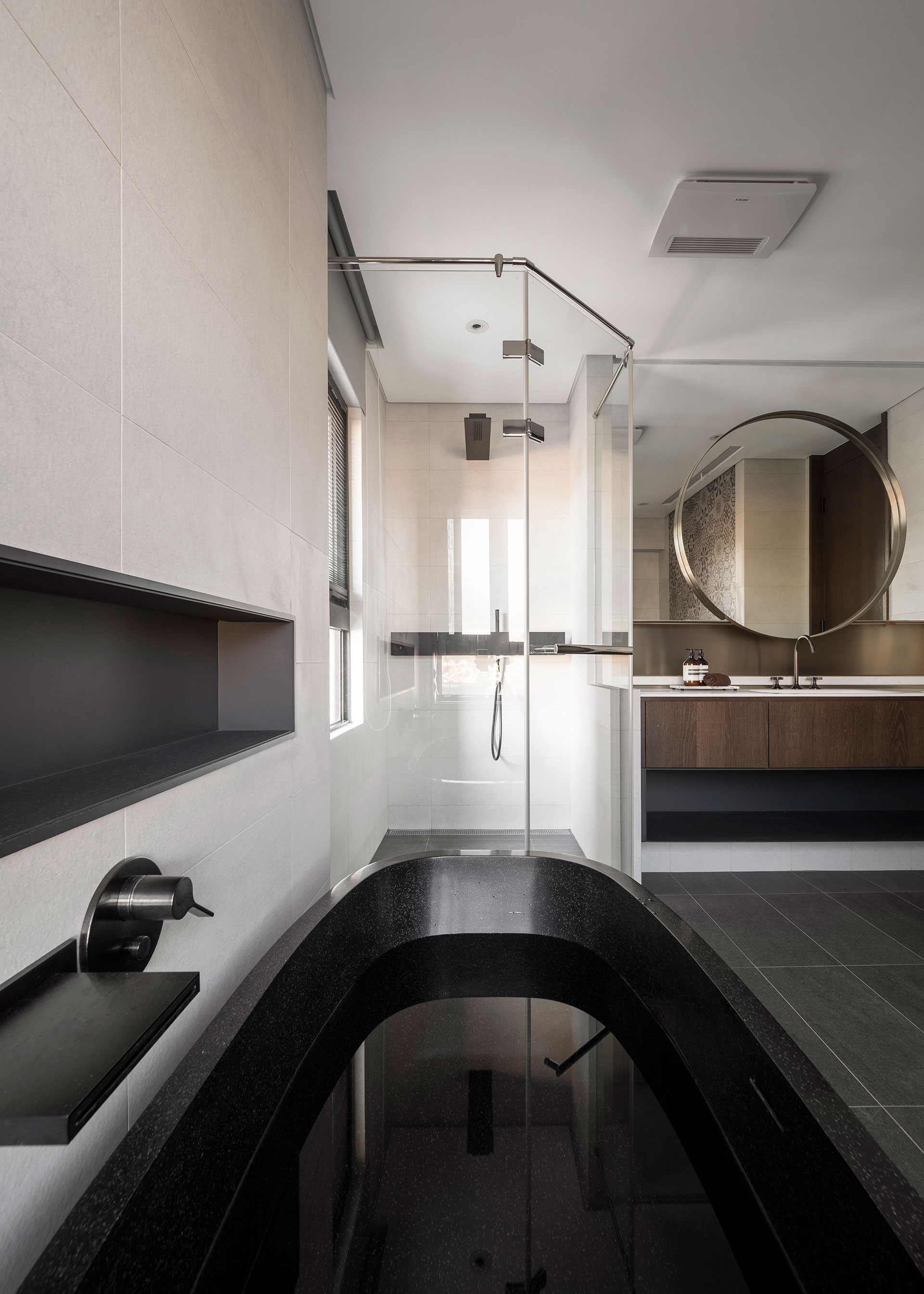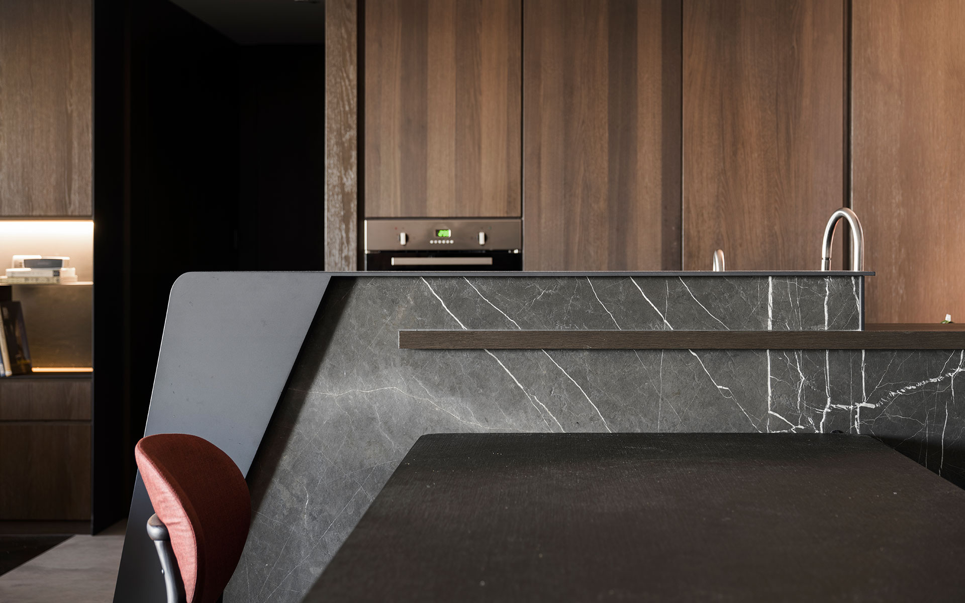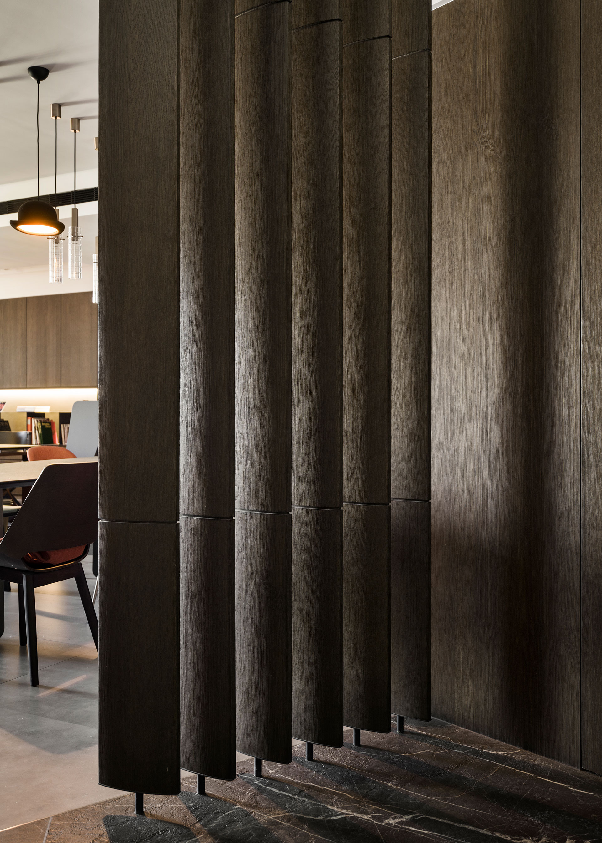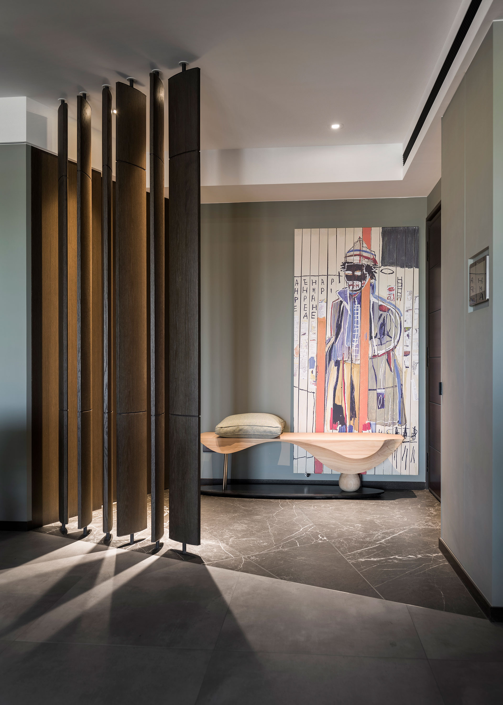 屋主是年輕的設計人,喜歡古典與現代並和的元素。以連續鏤空的直向折板屏風與不規則切割地板,微間隔出一個玄關空間,與玄關座椅與畫作的藝術風格,顯現了居家也能是藝術品典藏的場所。在客廳裡造了一座六米長的磚牆,將客餐廳空間串連整合一起,延續性的手法,讓空間有大視覺主體以擴展橫向視野。客廳沙發與書房,整合在一個塊面上,餐廳與廚房、吧台在對稱方位,家中公共空間的聚合與獨立區域,同時發生,而在材質上,以咖啡色系質感建材穩穩為底,深與淺,色系的漸層成了各功能的分野,再加上鐵件適時穿插使用,將懷舊的元素與工業都會的氣息相融合,在看似的衝突對比中,展現出意想不到的趣味接合感。