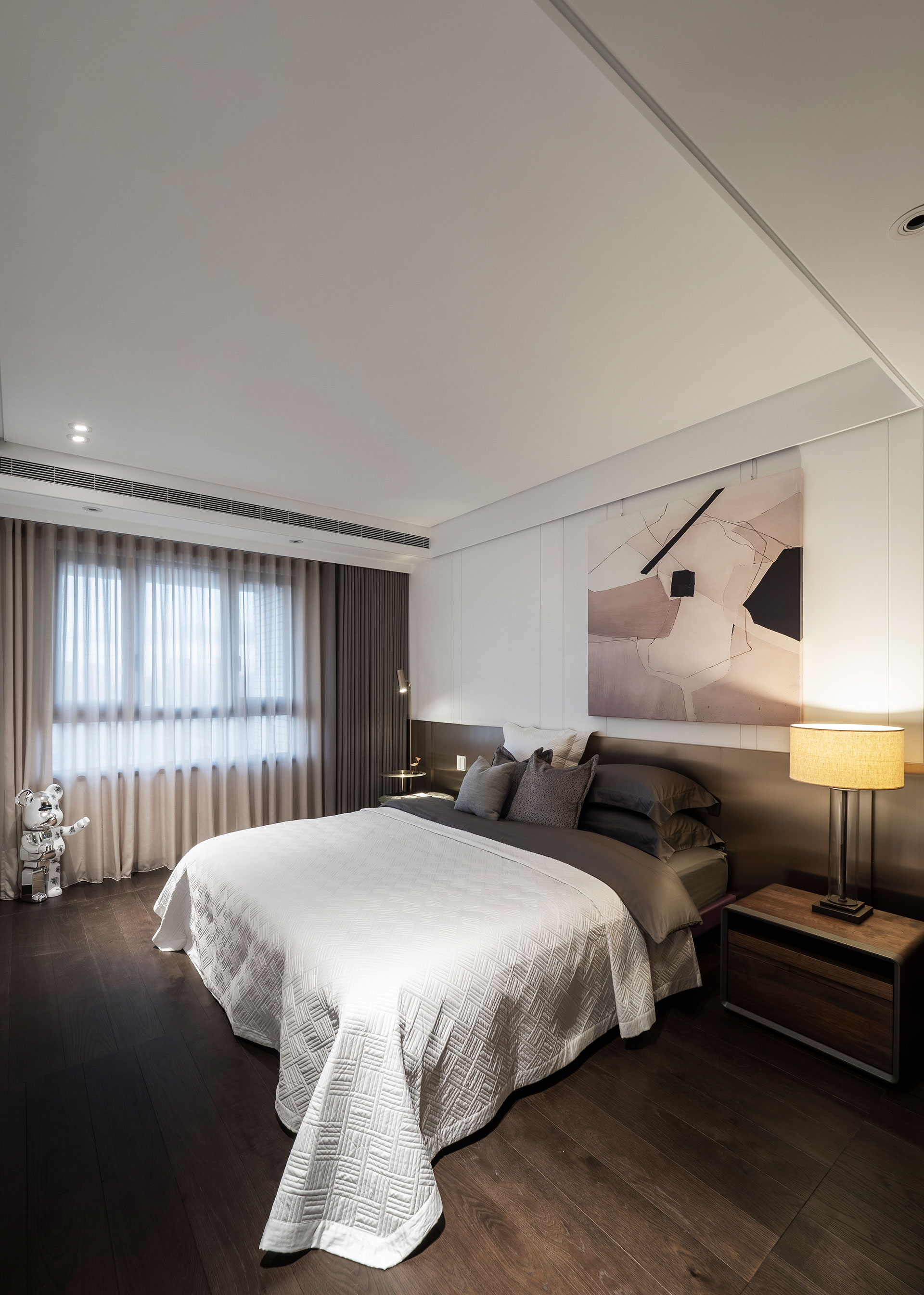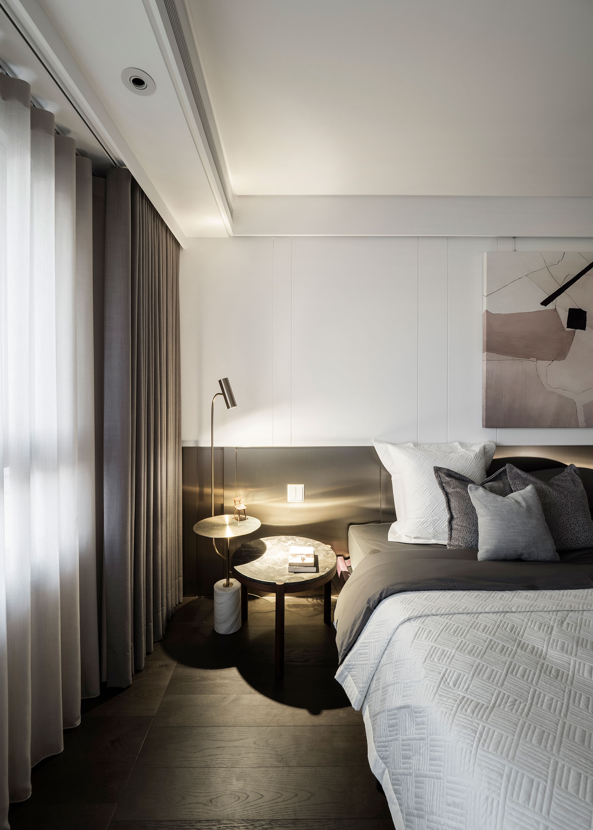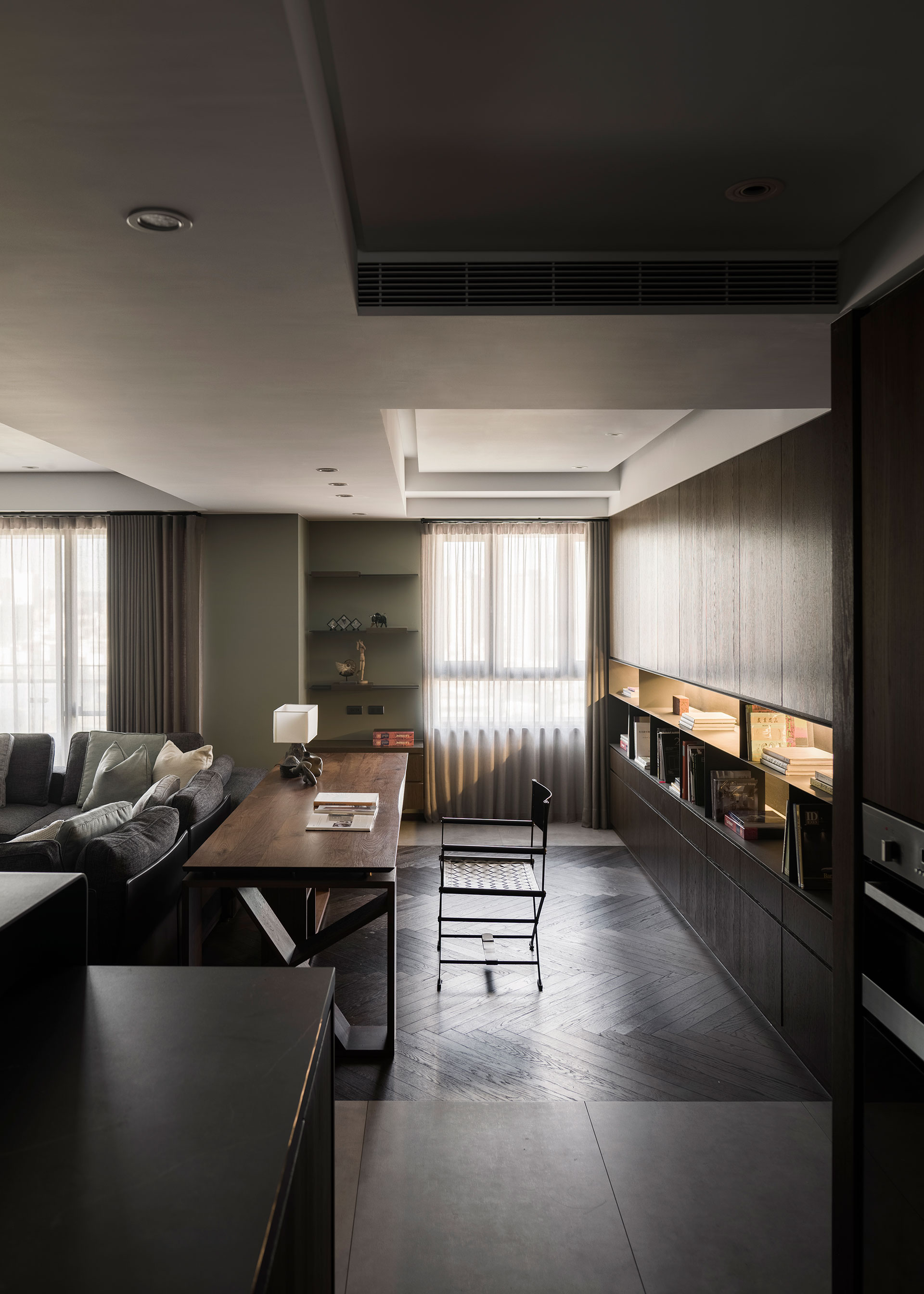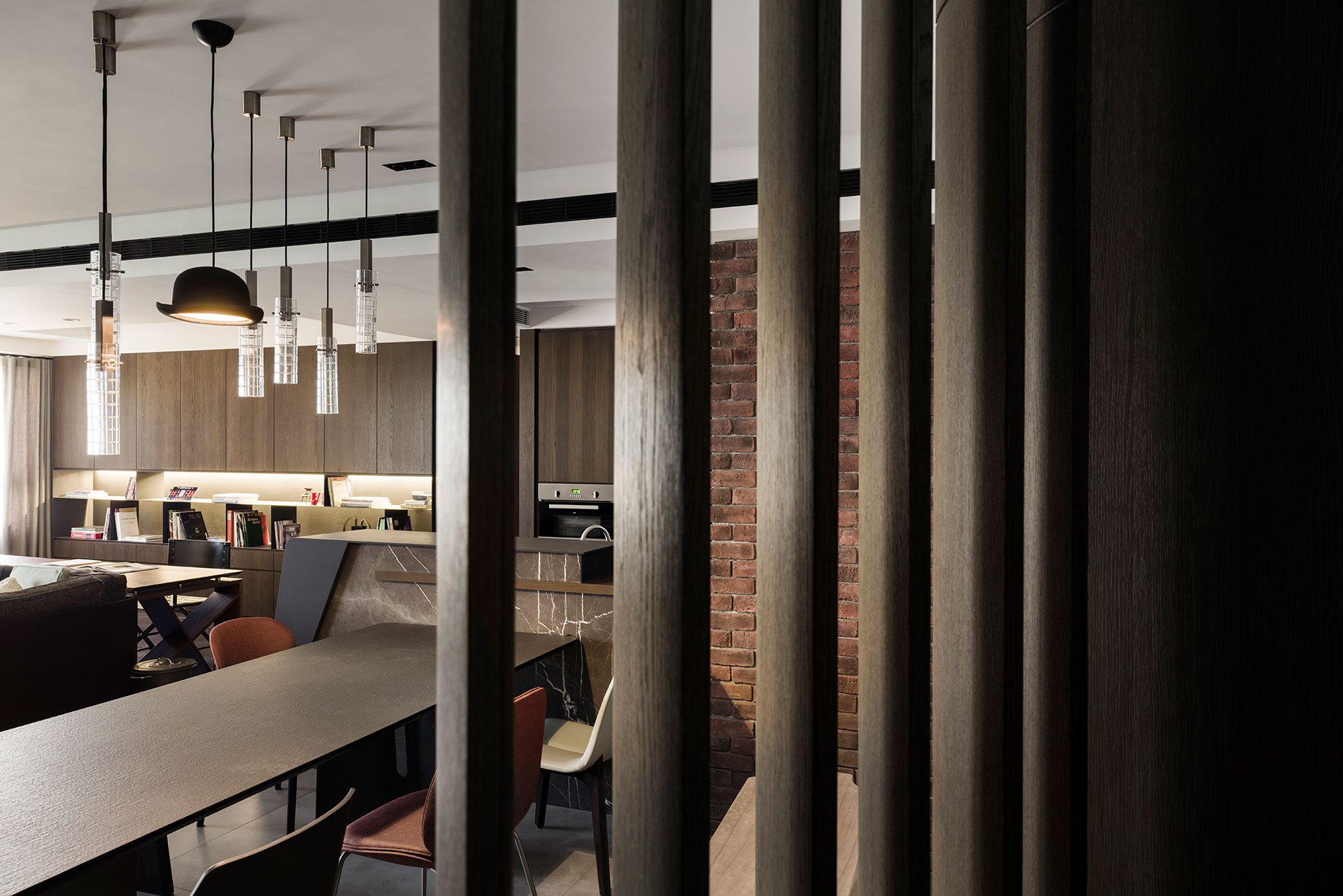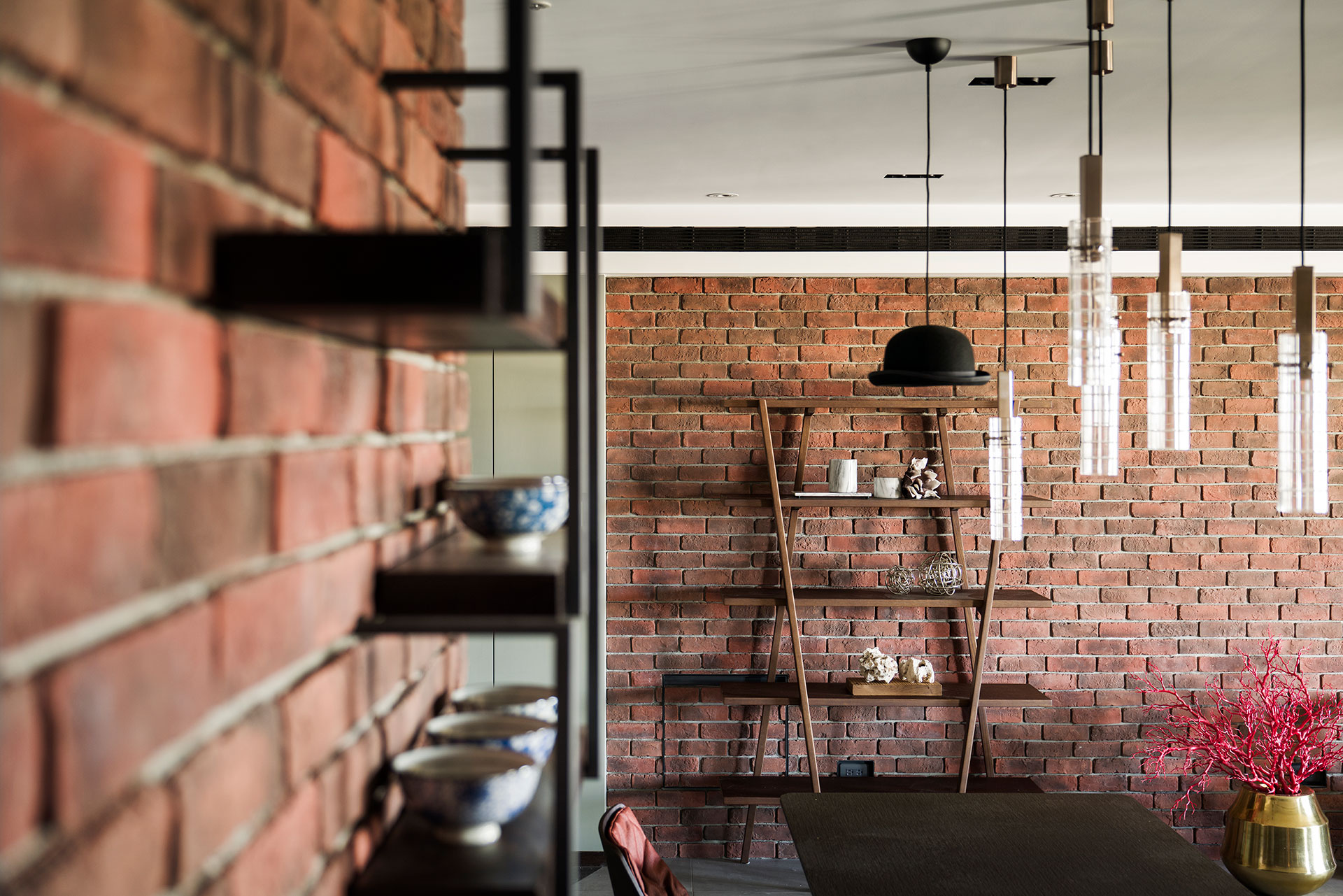 The owner is a young designer who celebrates the juxtaposition of classical and modern elements. A series of perforated folding panels and the irregular division of floor patterns demarcate a porch space. Here the artistic styling of the chairs and paintings on the wall suggests the alternative role of the house as a gallery. The six-meter-long brick wall in the living room integrates the living and dining areas. The manner of continuity expands the transversal vision with a prominent figure in sight. The living room couch and the study occupy the same plane, while the dining room, the kitchen, and bar counter become its counterpoint, a simultaneous presence of the shared space and separate areas in the house. The materiality of metal and woods reveals the stability of a brown datum, in which different shades of the gradient allocate the functionality of each component. Fusing reflective elements with a metropolitan industrial atmosphere present an unexpected yet amusing articulation of the seemingly polarized conflicts.
